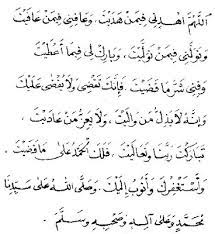 Allaahummah dinaa fiiman hadaiyt, wa 'aafinaa fiiman 'aafaiyt, wa tawallanaa fiiman tawallaiyt, wa baariklanaa fiimaa a'toiyt, wa qinaa syarromaa qodloiyt, fainnaka taqdlii walaa yuqdloo 'alaiyk.