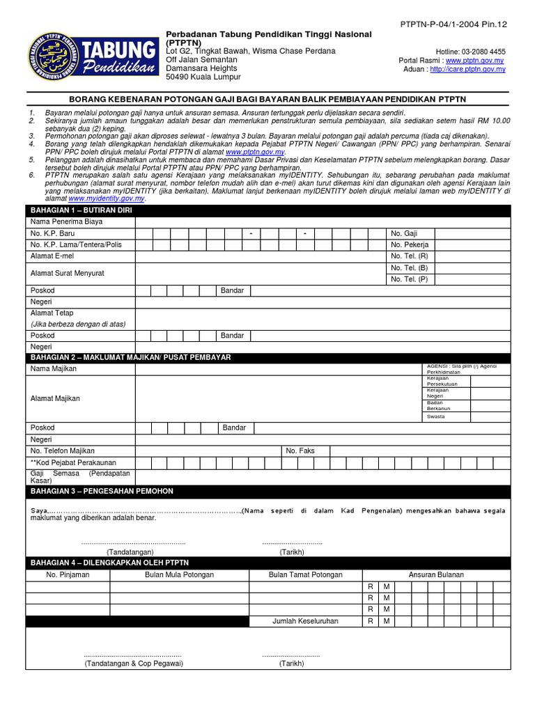 Kemudahan potongan gaji menggunakan borang spg asnb ini adalah terbuka kepada semua pegawai perkhidmatan awam potongan paling minimum yang dibenarkan ialah sebanyak rm10.00 sebulan dan potongan tambahan dalam gandaan rm1.00. Ini bermakna, jika saudara ingin meminjam kenderaan atau komputer, jumlah potongan gaji dicampur dengan potongan sedia ada tidak boleh melebihi 60% daripada jumlah gaji pokok. Maklumat berikut hendaklah diisi dengan lengkap. Hal ini diatur dalam pasal 57 ayat 2 dan 3 pp 78/2015. Saya membenarkan untuk *berhenti/kurang/tambah potongan gaji bulanan saya bagi.